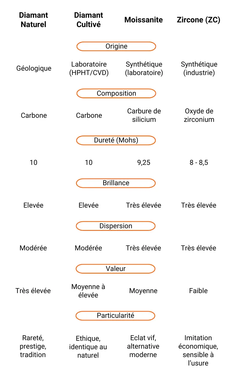 💡 À noter : seuls le diamant naturel et le diamant cultivé partagent une composition identique. Les deux autres pierres sont totalement différentes sur le plan chimique, bien qu’elles puissent en imiter l’apparence.
